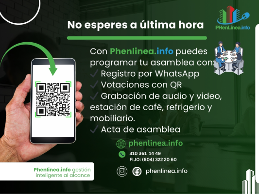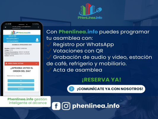 Con Phenlinea.info, puedes realizar todo el proceso de forma sencilla, rápida y segura. Facilita la comunicación con los copropietarios y mejora la organización de cada reunión. ¡Di adiós al papeleo y los procesos manuales!